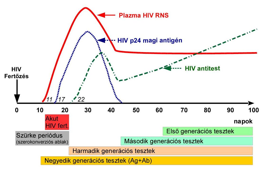 A HIV fertőzés kimutatása a használt vizsgálati módszertől, teszttől függően az eseményt követő 12.-90. nap után lehetséges.